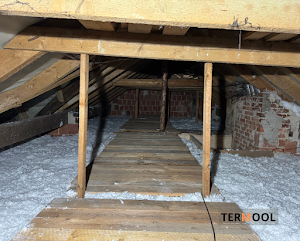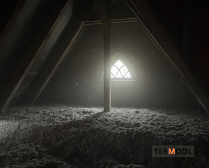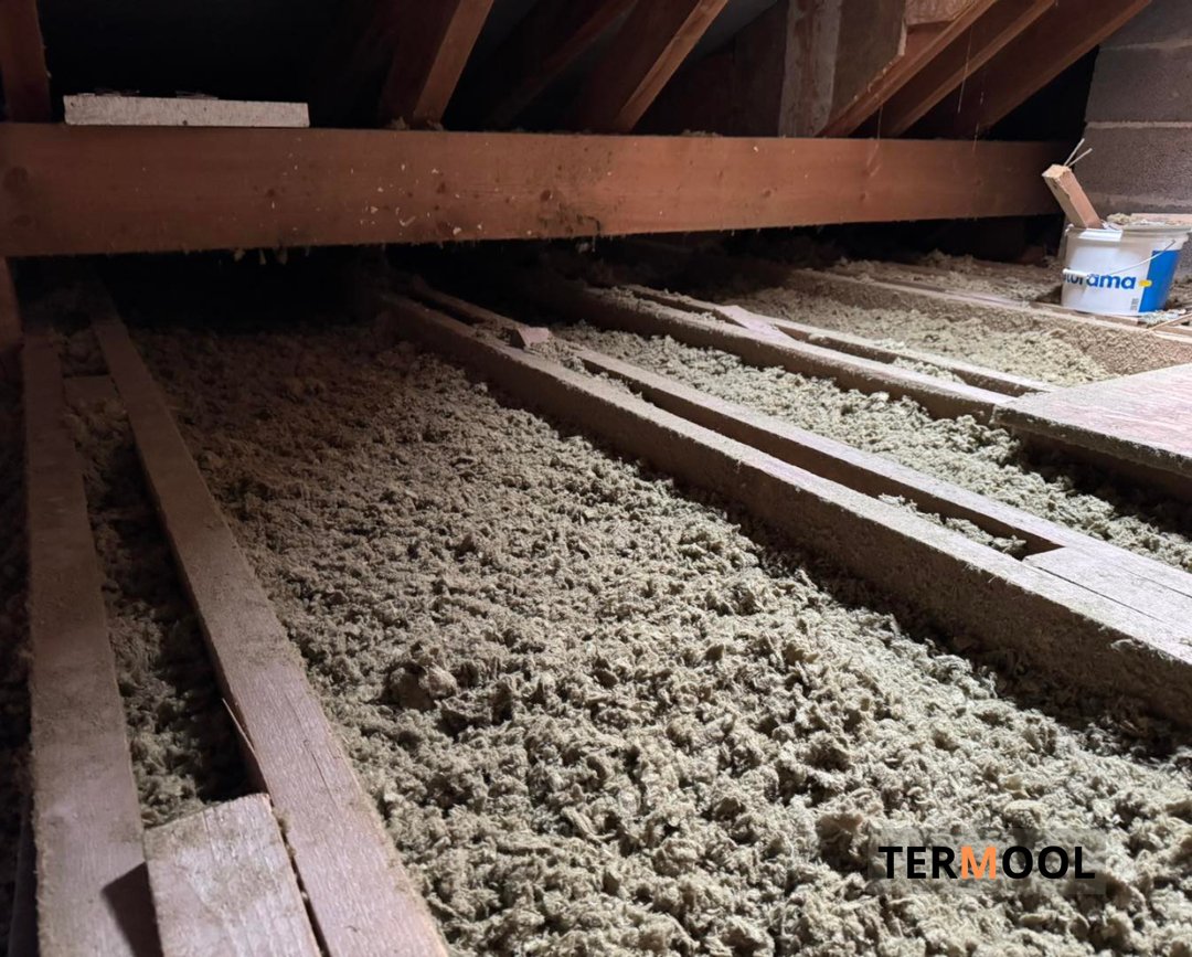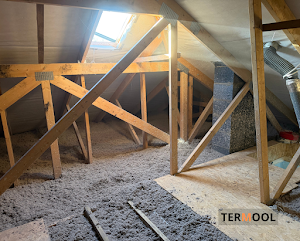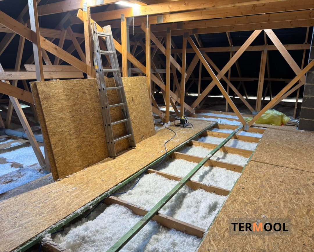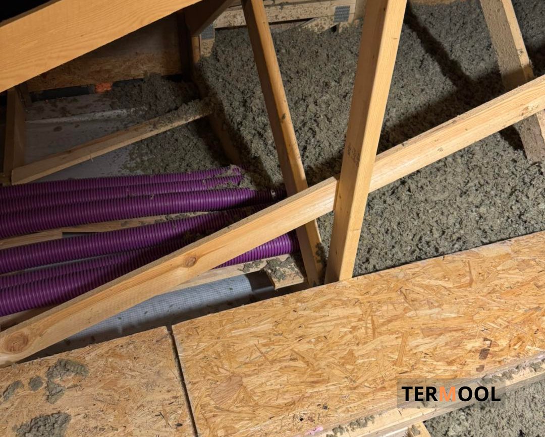 Na zdjęciach poniżej przedstawiamy strop zasypany granulatem wełny skalnej
